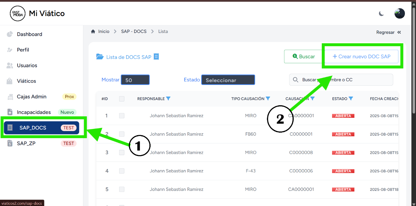- 2. Clic en botón " + Crear nuevo DOC SAP".